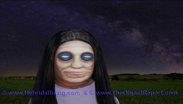 “The one female Being I saw clearly was short and pudgy with wrinkled skin and appeared to be malformed, or at least, was very strange looking. She had vivid blue eyes. I did not see a pupil like ours, but rather a white pupil that was shaped like a horizontal slit. She had dark hair that was longish and tousled. She was telepathic and when I was looking at her, I felt I had to keep my thoughts from her because she was so difficult to look at. There was a young man who appeared to be in his late twenties standing next to her and he may have in fact been a Hybrid. He was almost physically sick simply from being in her presence. He could hardly look at this Being and he appeared as if he was on the verge of both crying and vomiting.”