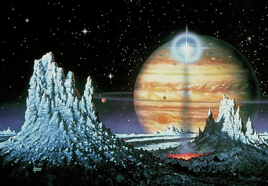 A staple of science fiction paperback artwork for much of the 1960’s, 70’s and 80’s, as well as the magazines of that time, Hardy produced work for names such as Isaac Asimov, Arthur C. Clarke and Carl Sagan. Clarke describes the artist’s work as “poetically luminous” a very apt description, and also praises his scientific accuracy, as one professional to another.