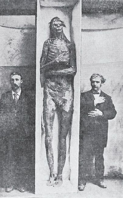 When Russell and Bovee began to explore the caverns, they followed one tunnel where they were extremely surprised to find the mummified remains of three gigantic men who were 8-9 feet tall. The giants were clothed in garments consisting of a medium length jacket and trousers extending slightly below the knees. The texture of the material was said to resemble gray dyed sheepskin, but they believed it to be taken from an animal unknown today. The room also held a number of artifacts that resembled Egyptian and American Indian designs and hieroglyphics were chiseled on carefully polished granite. The explorers believed they had found the burial place of the tribe’s hierarchy.