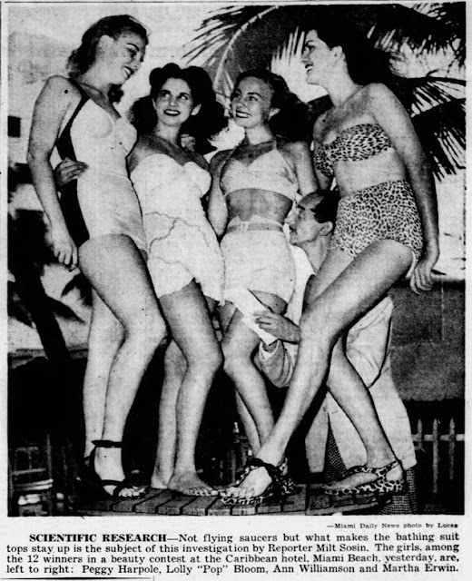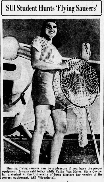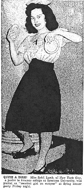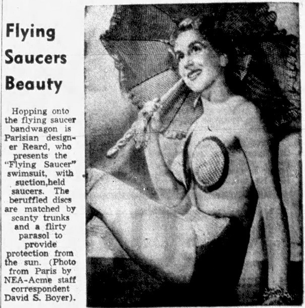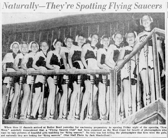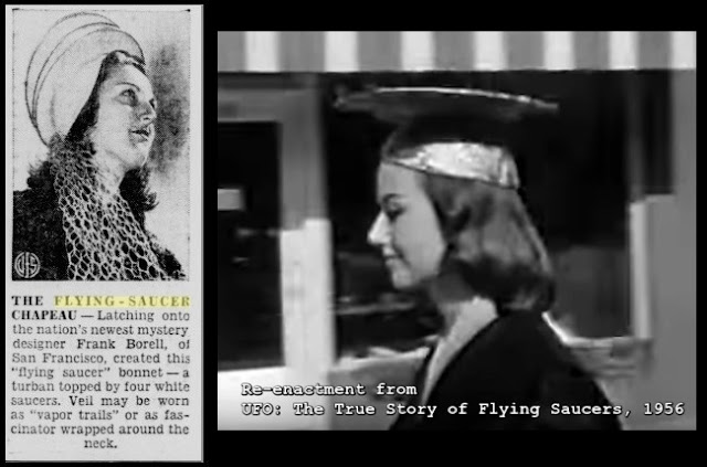 The same day, and in the weeks that followed, there were many less legitimate photographs, some of them more in the way of pin-ups. Newspapers staged their own photos, often printing pictures of pretty young women allegedly searching for saucers, or posing with bogus UFOs, or sometimes no saucer at all, just mentioned in the caption. A few novelty pieces featured flying saucer hats or other out-of-this-world fashions.