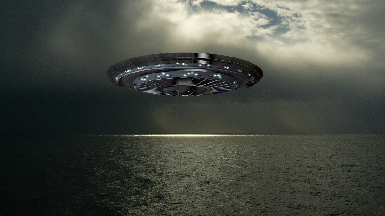 Cigar-shaped UFO flying over the water (artist’s impression)